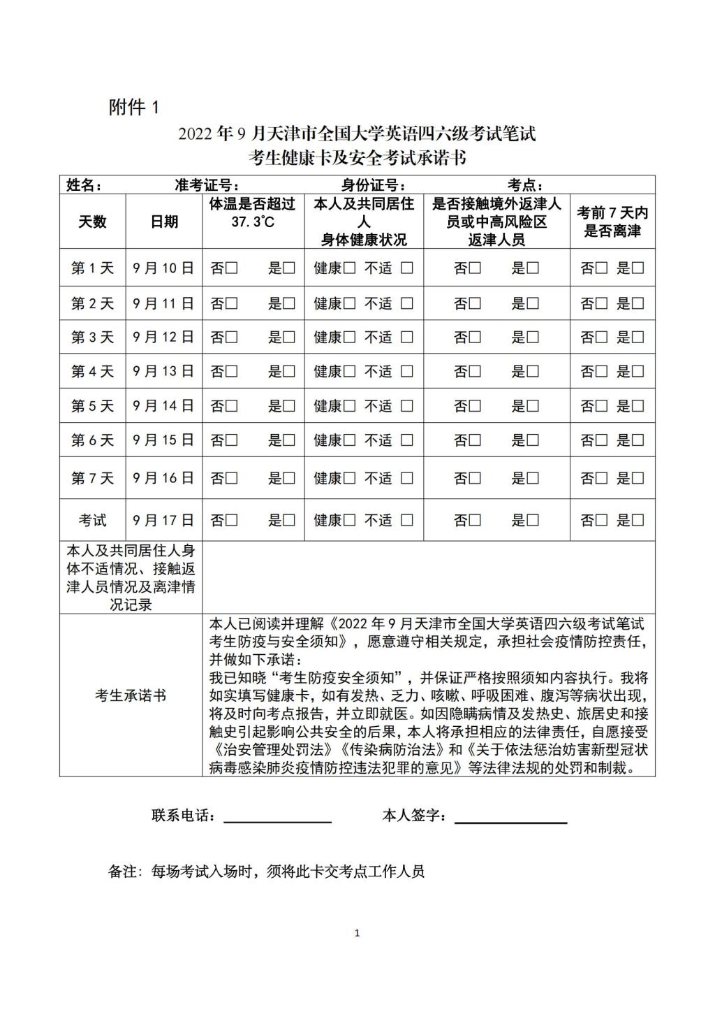 2.考生須至少于考前7天(9月10日前)填寫《2022年9月天津市全國(guó)大學(xué)英語(yǔ)四六級(jí)考試筆試考生健康卡及安全考試承諾書》和《流行病學(xué)調(diào)查表》,按規(guī)定如實(shí)填寫健康卡和流調(diào)表,記錄體溫,簽署安全考試承諾書,并在考試入場(chǎng)時(shí)交給監(jiān)考人員。