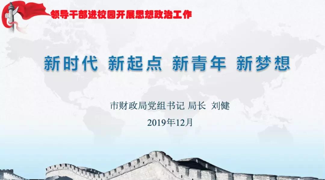 為深入貫徹落實習近平總書記在學校思想政治理論課教師座談會上的重要講話精神,深入推進領導干部進校園開展思想政治工作,12月11日,市財政局黨組書記、局長劉健到我校以“新時代、新起點、新青年、新夢想”為題,為師生講思政課。我校黨政領導班子成員出席,全體思政教師、學生代表、黨辦、黨宣部門工作人員到場聆聽。
