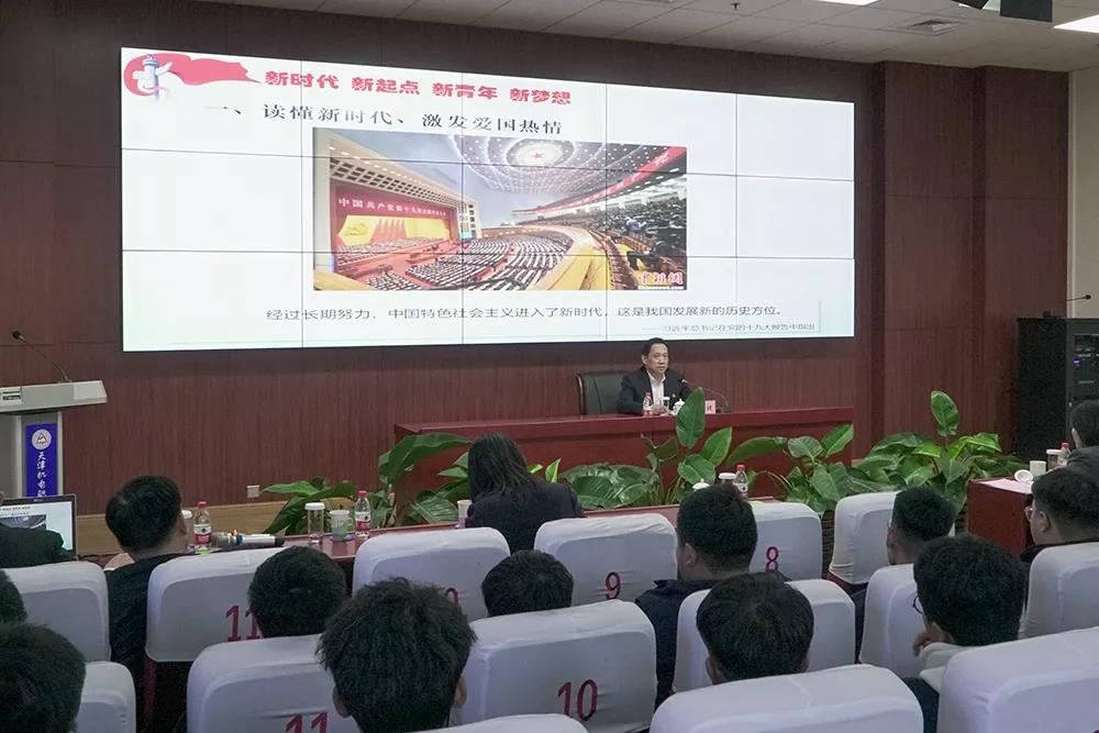 劉健同志的思政課,以“新時代的中國:活力天津走向世界”天津全球推介活動暖場片為開場,迅速抓住了在場師生的心。報告分為“讀懂新時代、激發愛國熱情”和“傳承工匠精神、匯聚磅礴力量”兩個篇章。劉健同志首先結合自己多年的工作學習經歷,通過鮮活的案例,詳實的數據,以故事分享的形式,與師生們一起深情回顧了新中國成立70年來取得的輝煌成就。結合黨史、新中國史,對我國堅持和完善中國特色社會主義制度、推進國家治理體系和治理能力現代化進行了深入解讀,幫助大家深入理解把握黨的十九屆四中全會的精神實質。在報告第二部分,劉健同志特別結合職業院校實際,從勇做大國工匠的高度,與大家分享了 “藍領創客”張黎明的電力搶修人生和魯班工坊走向世界的故事,用榜樣的力量,激發大家憑借一顆滾燙的心和過硬的技術,立志做知識型、技能型、創新型勞動者。在報告最后,劉健同志從“小我”和“大我”兩個層面,激勵青年學生深扎技術一線,苦練本領,增長才干,爭做當代中國馬克思主義的學習者和傳播者、社會主義核心價值觀的領會者和實踐者、中國特色現代化強國的奮斗者和創造者、中華民族偉大復興夢的構筑者與實現者、人類命運共同體的構建者與推動者,與時代同步伐,與祖國共命運,與人民齊奮斗,讓青春在奉獻中煥發更加絢麗的光彩。