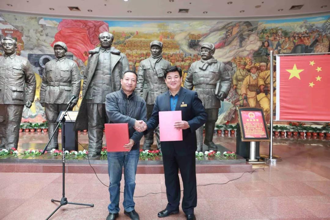 隨后,平津戰役紀念館副館長林泰山和天津機電職業技術學院副校長袁子明代表雙方互換協議。平津戰役紀念館黨總支書記、館長王培軍和天津機電職業技術學院黨委書記王千文共同為愛國主義教育基地揭牌。