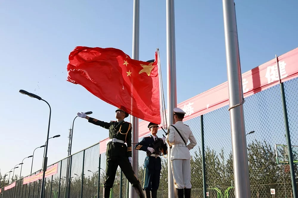 伴隨著初升的朝陽,在鏗鏘有力、整齊劃一的腳步聲中,國旗班護衛隊來到升旗臺前。嘹亮的國歌響徹整個體育場,鮮艷的五星紅旗徐徐升起。在場師生莊嚴站立,面向五星紅旗高唱國歌,激情澎湃。