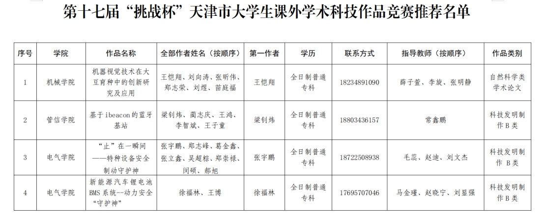 按照《關于組織開展第十七屆“挑戰杯”天津市大學生課外學術科技作品競賽的通知》和《關于第十七屆“挑戰杯”天津市大學生課外學術科技作品競賽作品申報工作的通知》要求,學校推薦四件作品,參加第十七屆“挑戰杯”天津市大學生課外學術科技作品競賽。現將推薦名單予以公示。
