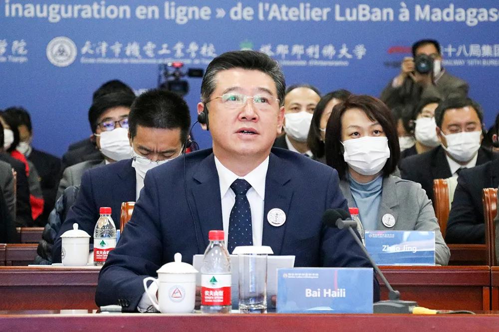 天津市委教育工委委員、天津市教育委員會副主任白海力致辭,他指出,2020年是中馬建交48周年,是中馬關系發展的重要時間坐標。馬達加斯加魯班工坊揭牌,預示著將在汽車工程和電氣工程等方面為馬國培養高級技能人才,也必將成為馬達加斯加職業教育乃至學歷教育的新標桿。祝愿工坊發揚工匠精神,為馬達加斯加培養出更多適應國家發展的高技能人才,為中馬職業教育合作開創新紀元。