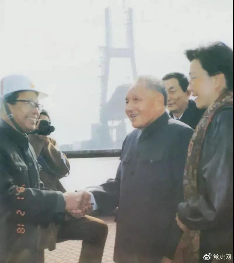 1991年2月18日,鄧小平視察上海南浦大橋工地時(shí)同大橋工程設(shè)計(jì)人員握手。